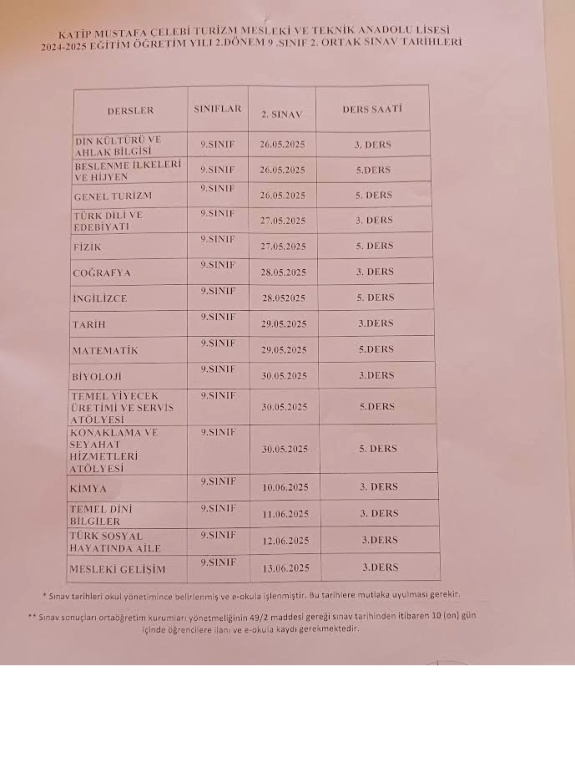 9. Sınıf II. Dönem 2. Ortak Sınav Tarihleri